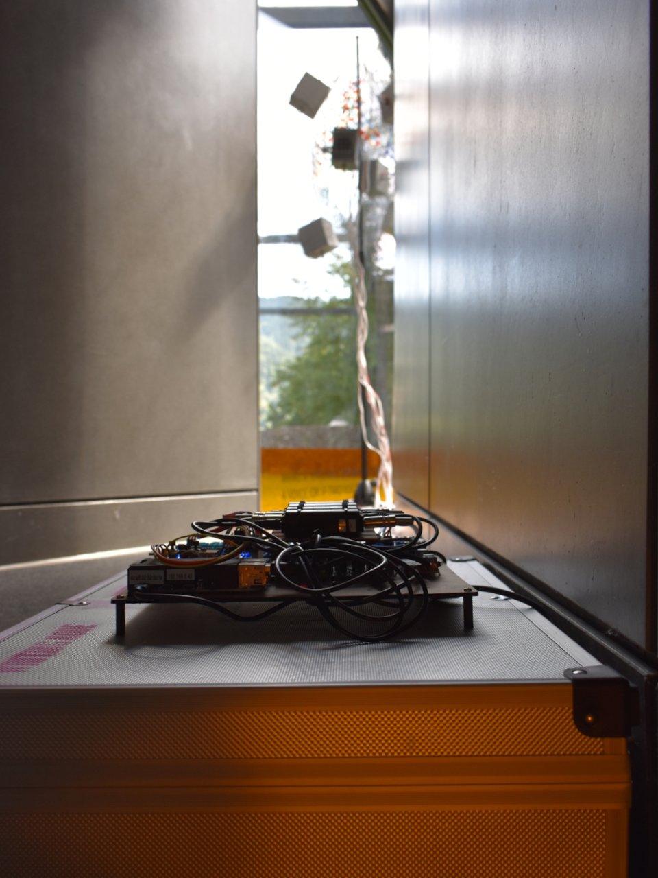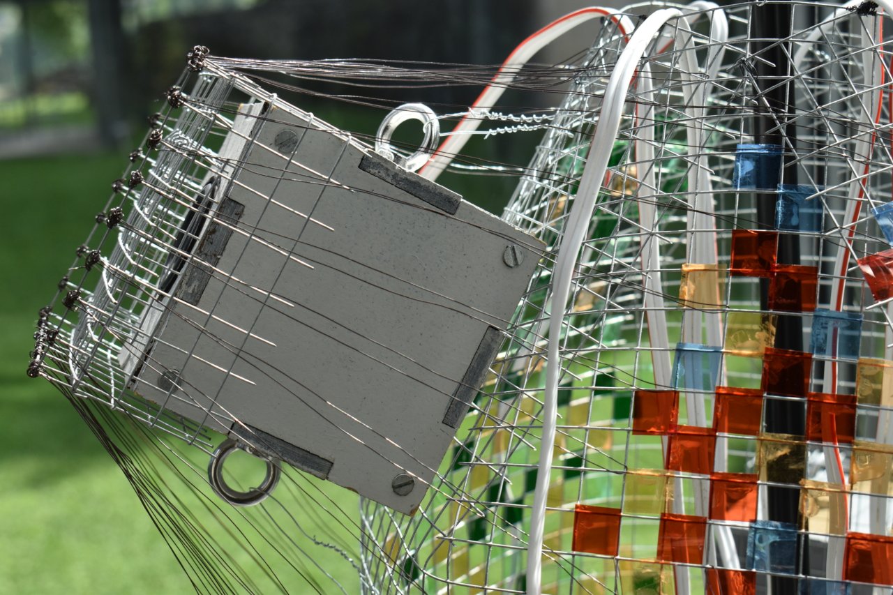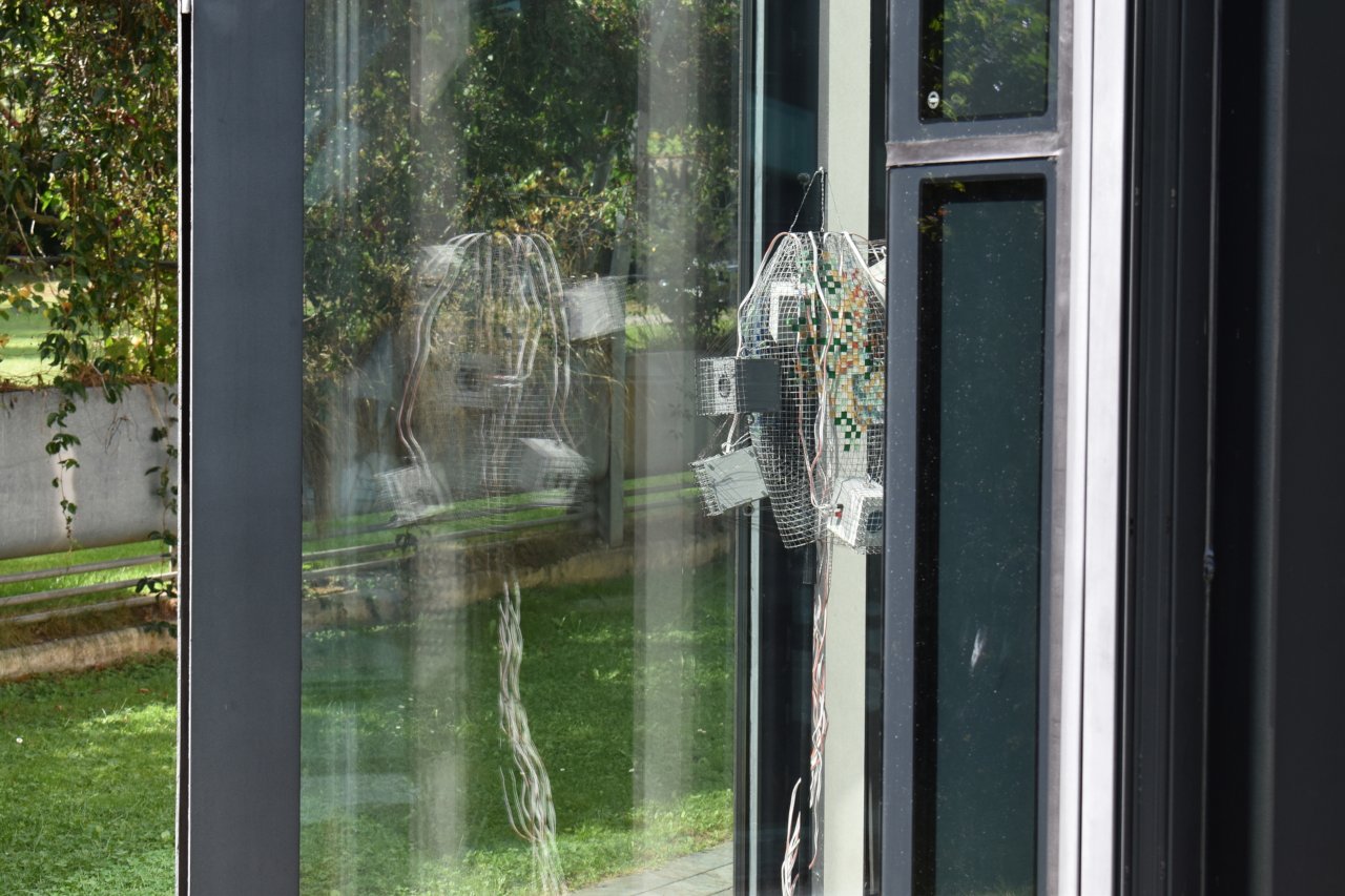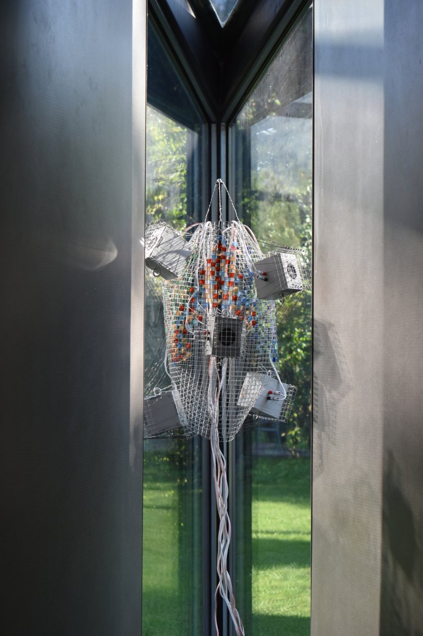 Towards of our research interval, I searched for a new form to replace the specific site, settling on a Medusa-shaped wire body, with now six of the small gray speakers embedded. When the piece was shown at Domenig Steinhaus in Carinthia, I added translucent coloured scales to the body. The sixth voice and text was provided by Andrea Bakketun, the artist-researcher that joined us in the third interval of simularr. At Steinhaus, the whispers that move around the sculptural object are accompanied by electroacoustic sounds again. The object is placed in the ‘wedge’ of the building, with a vinyl text on the glass window. This work invites exploration of sound, space, and collaborative creation.