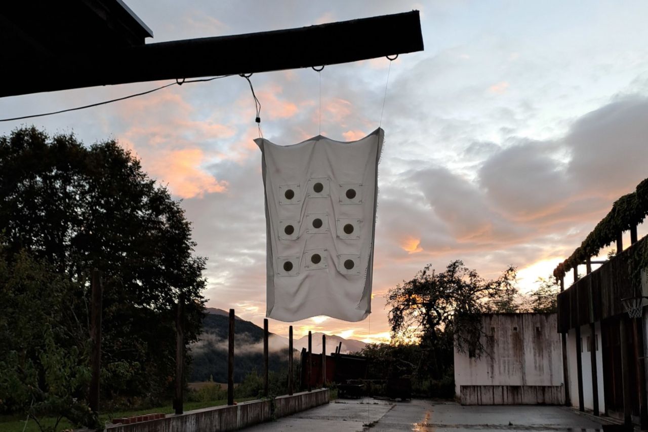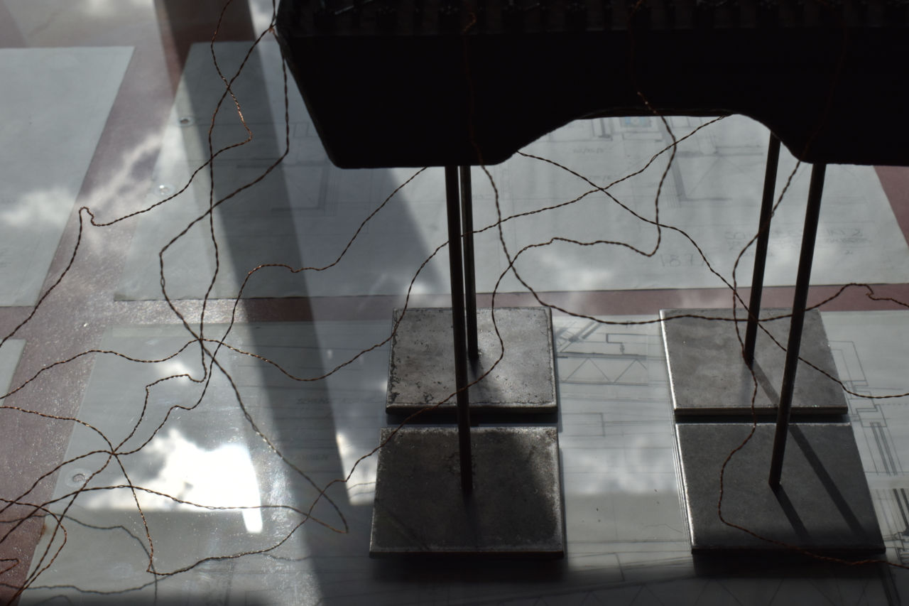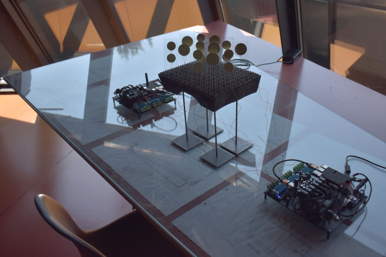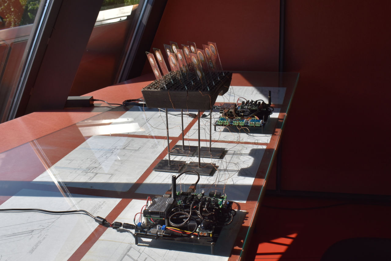 Outside is their natural habitat, but indoors the reticules require different setups. At the exhibtion in Domenig Steinhaus, nodes placed on a table with interlaced glass create dynamic electroacoustic pieces, responding to each other and the environment by way of microphones. This composition invites close listening, forming a nuanced sound space as one moves their ears near the setup.