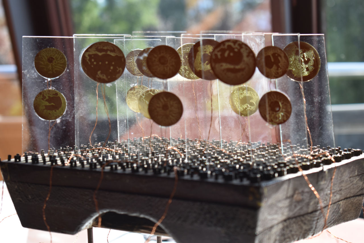 The reticules, adaptable and open-ended, became a “field kit” during the simularr research project, consisting of glass slides and piezos in portable aluminum cases. A third case held a custom-built “node” with a miniature computer, audio amplifiers, and interfaces. These reticules were arranged around the Hoke Werkhaus garden, interacting with water, leaves, bricks, and sounds from other artists like water and voices. In this piece then, I returned to the first object given to me that inspired the name, a wooden cliché (printing block) with a curious geometric pattern of metal teeth that would hold the small glass slides.