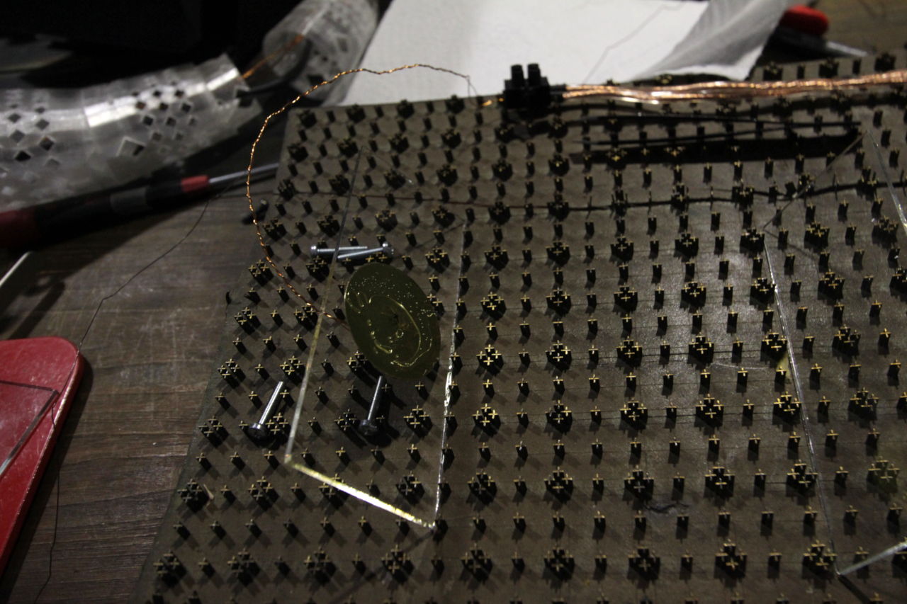 Completed after the piece Reticule (suspend), this installation is actually the first one that started in the series of reticules. The term “reticule,” linked to “retina,” originates from the Latin rete, meaning a fine network, and refers to grids like cross-hairs in telescopic sights. In this work, small glass slides paired with piezo elements create subtle, insect-like sounds. These sounds are faint and require a quiet environment and attentive audience.
