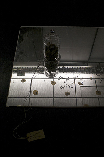 Voice Trap is a collaboration between me and Nayarí Castillo. Nayarí has been working with story fragments which combine factual and fictional elements, typically shown as a combination of written text and collected objects. Voice Trap is spun around the story of a girl who is haunted by voices. The story is written across four large mirrors on the floor of the room. Inspired by some strange bottles we saw in the Museum of Witchcraft in Boscastle, apparently used to trap ghosts, large jars filled with different materials are placed on the mirrors. The jars are tagged with the written description of a particular voice and their contents relate to the sound qualities of the imaginary voices.