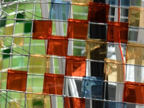 Sound installation (6 channels) with wire object and coloured grid, contributed whispered texts and electroacoustic materials.